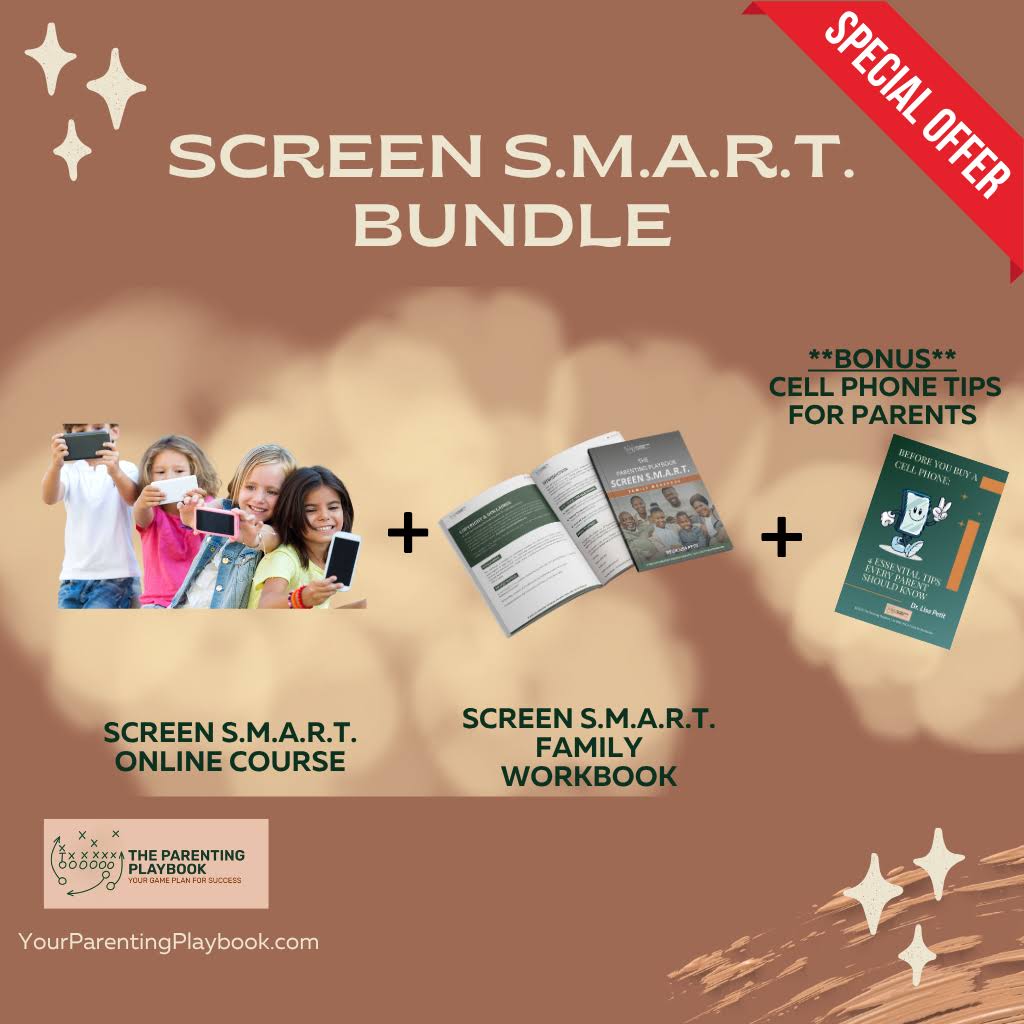 The Screen S.M.A.R.T. bundle is a set of resources created by Dr. Lisa Petit to help families build healthy digital habits. It includes an online course, a family workbook, and a cell phone mini-guide, all designed to foster responsible tech use and better parent-child communication about screens.